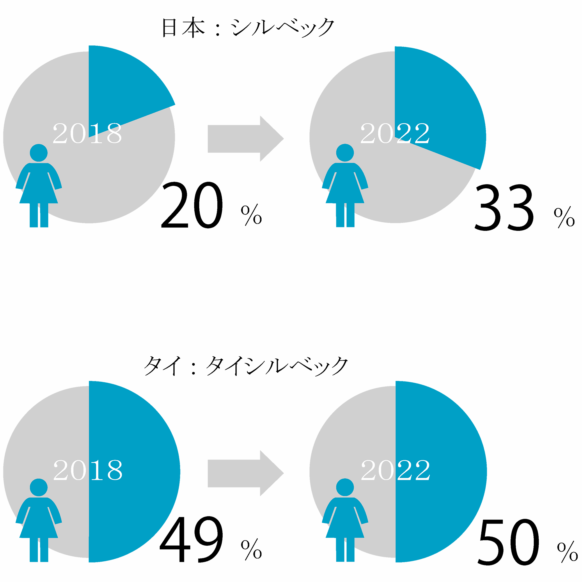 すでにタイ法人では高い女性社員比率を実現しておりますが、日本本社ではまだ20%と低いので2025年までに比率33%に上げていきたいと考えて活動を進めます。